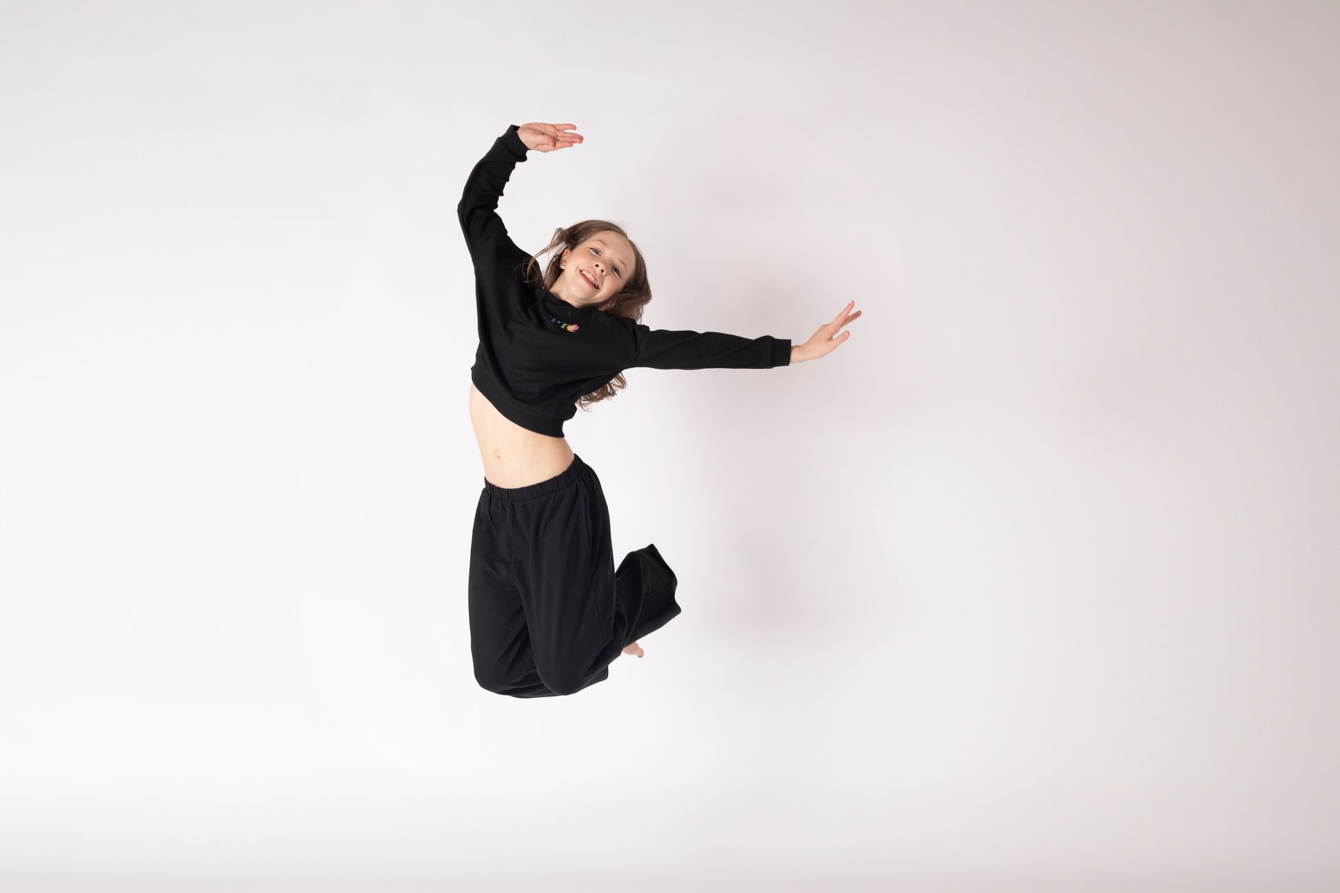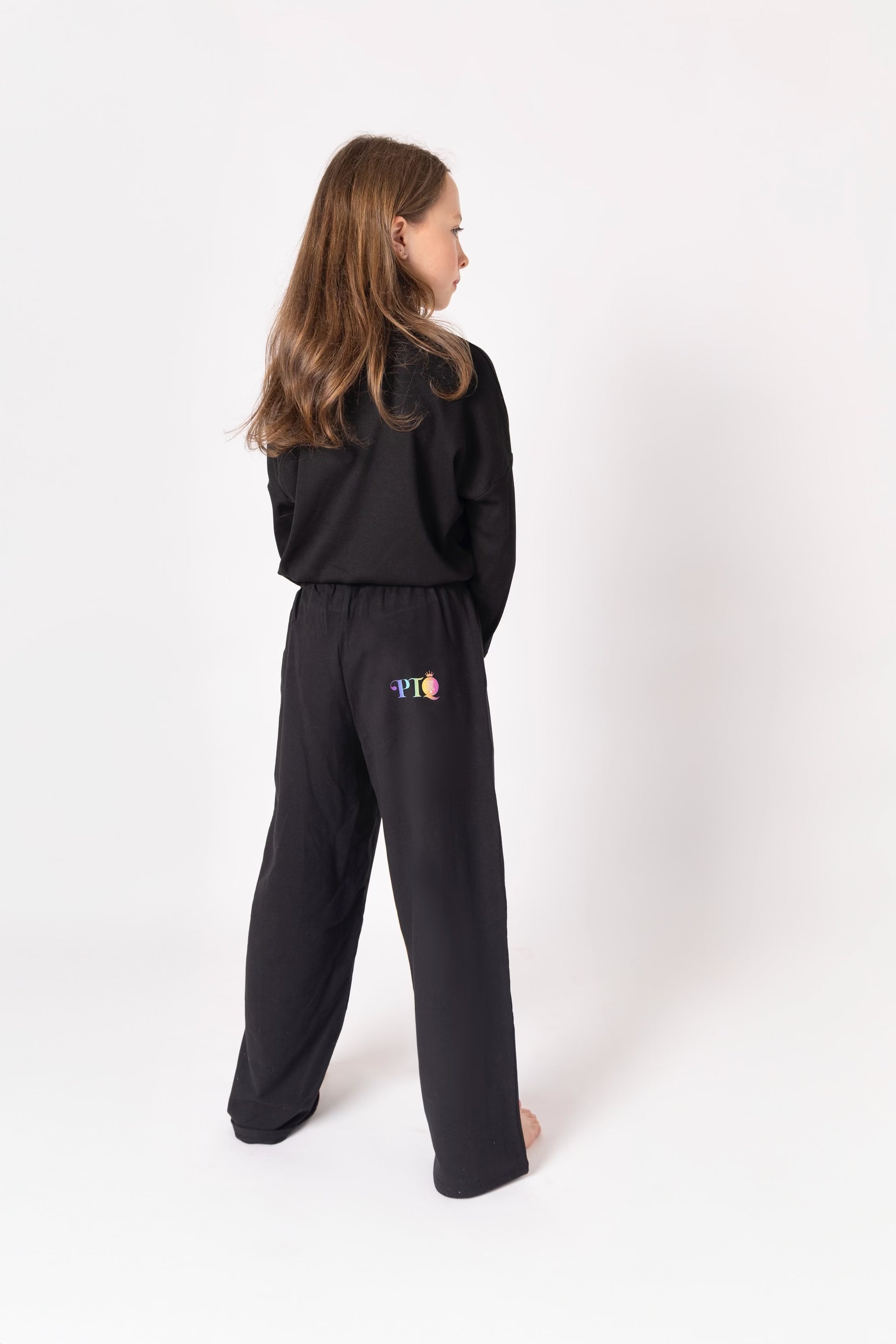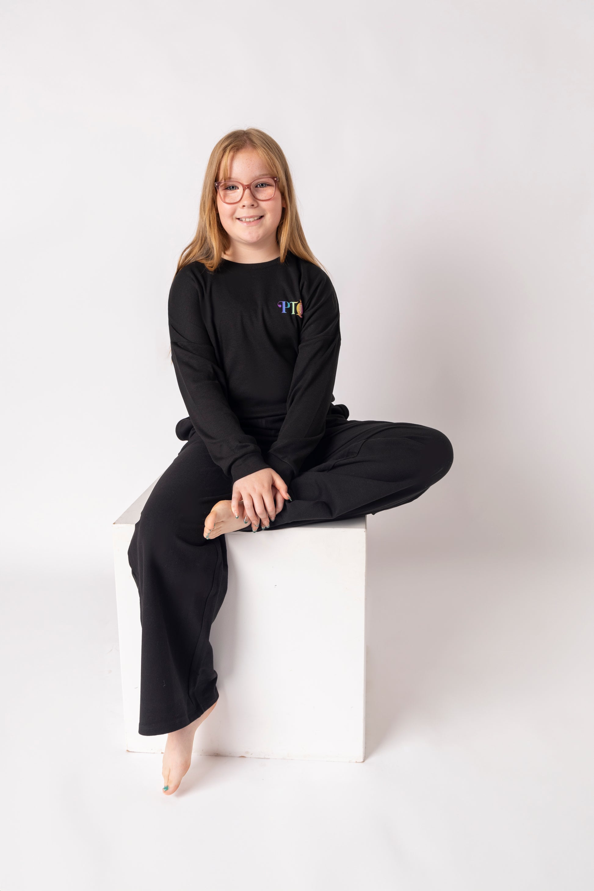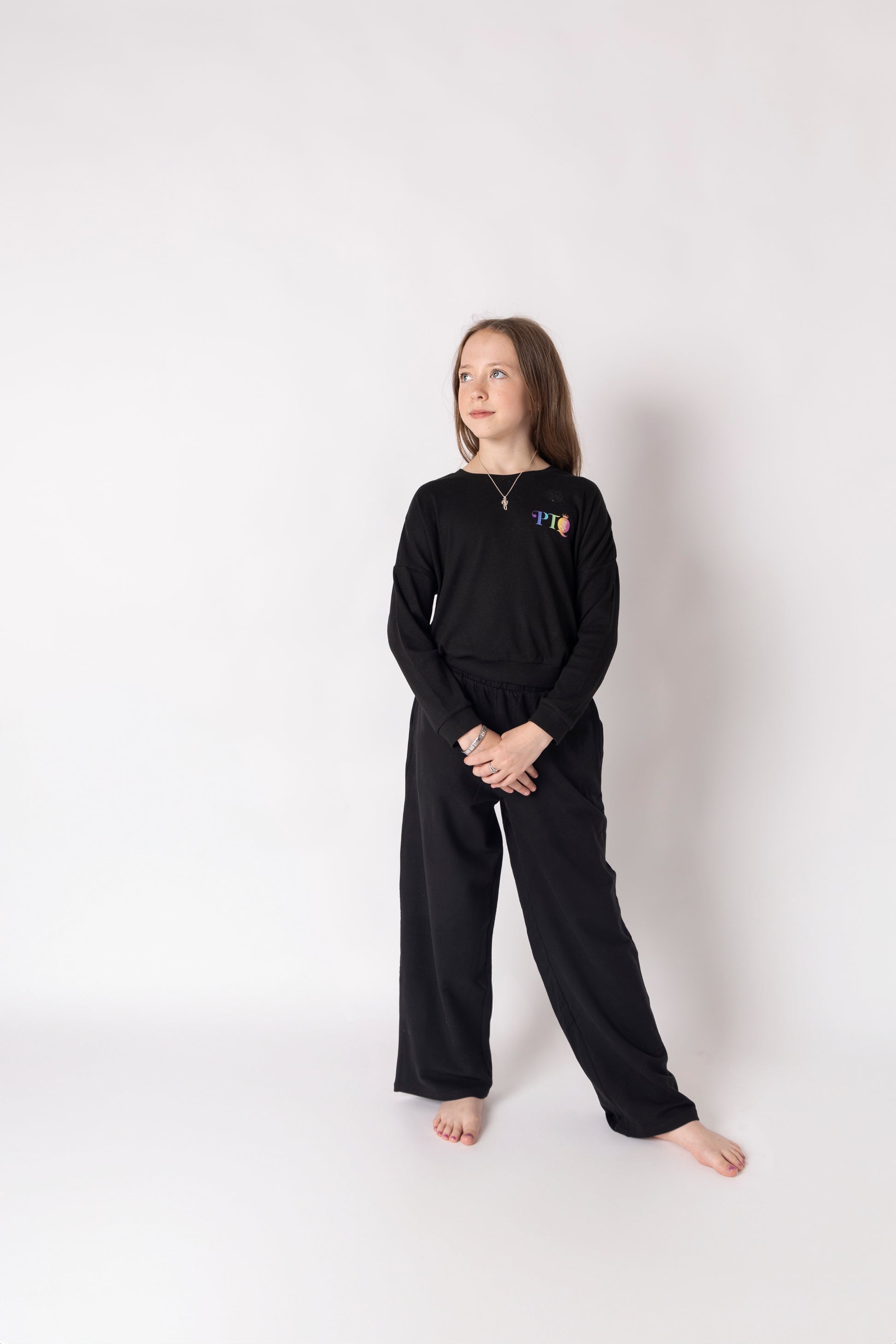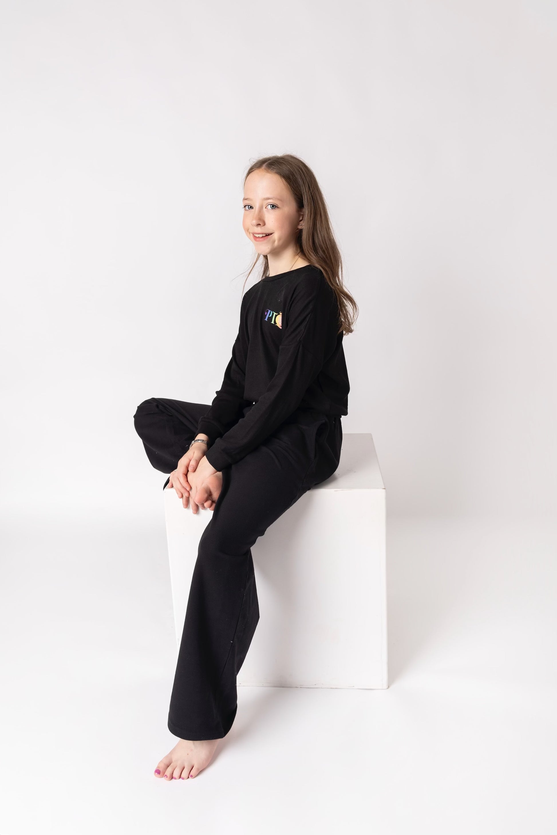 Pre Teen Queen lounge set in black. Cropped ribbed, long sleeved top and flared trousers.