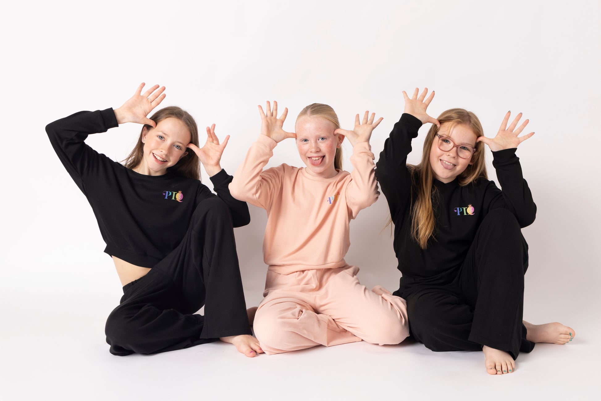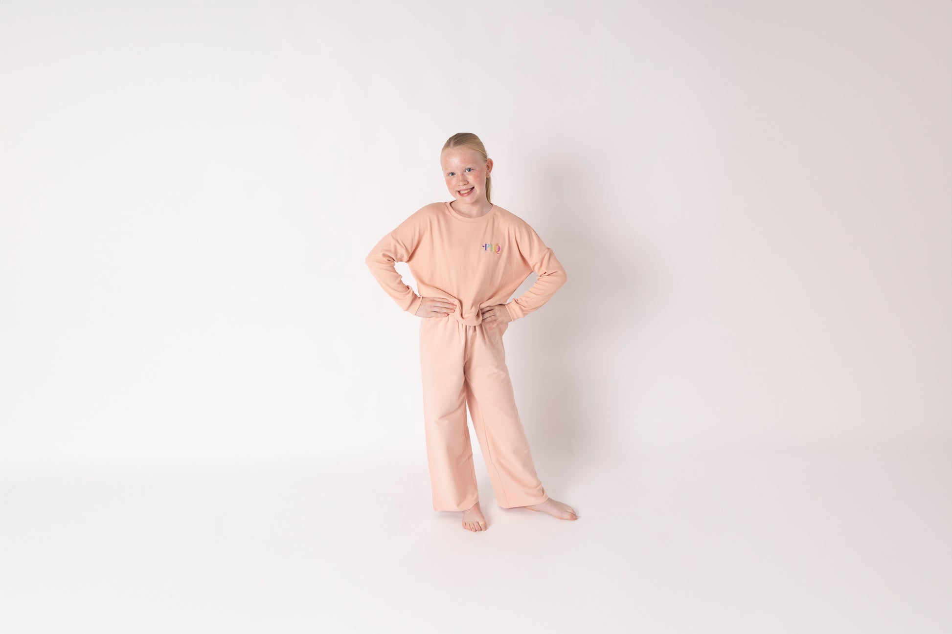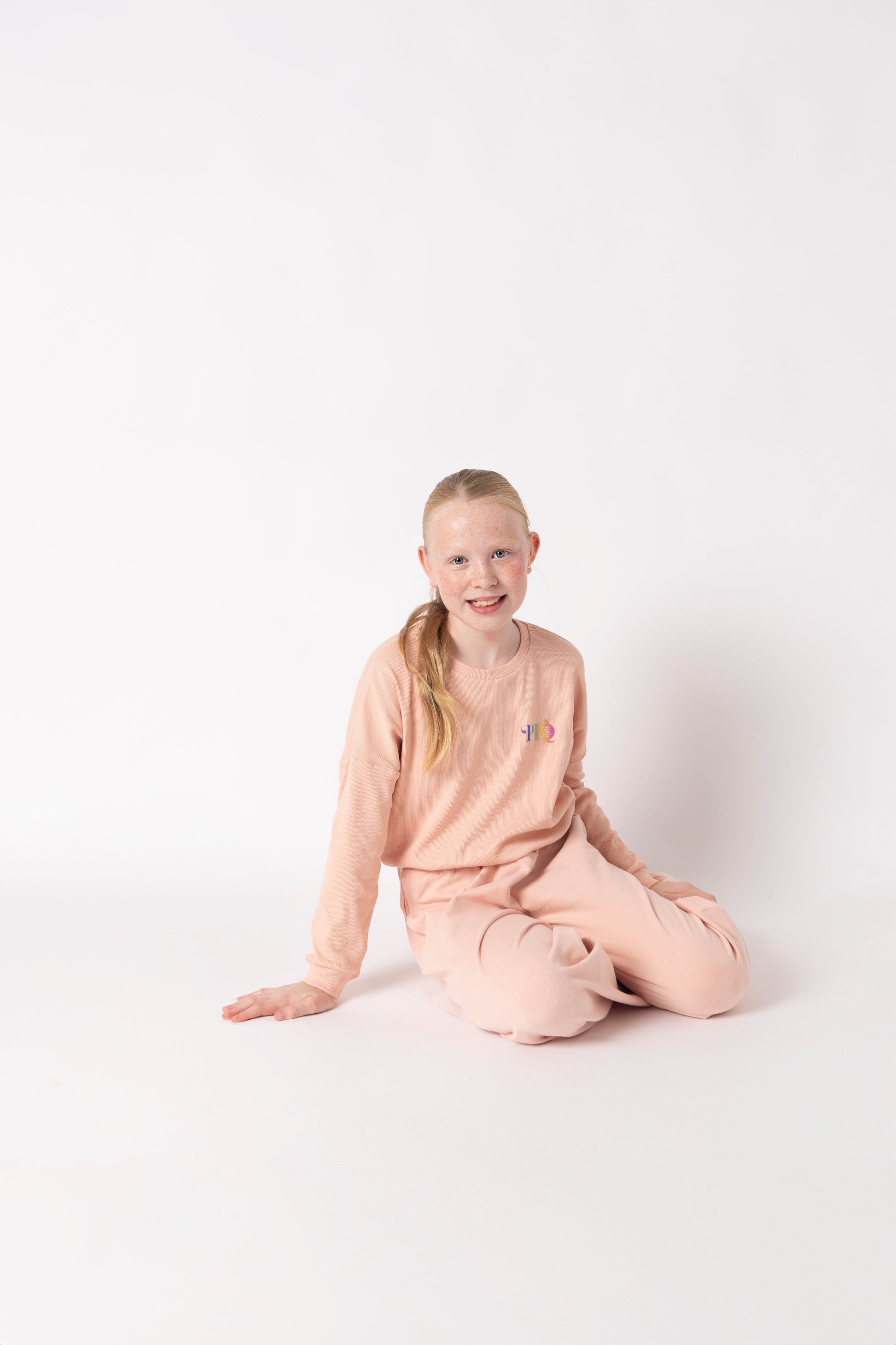 Pre Teen Queen lounge set in dusty pink. Cropped ribbed, long sleeved top and flared trousers.